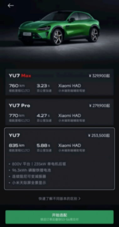 此次26日22时小米开售YU7时,分为两批车型,一种是“准现车”,均为YU7 Max,起售价35.04万元,锁单金额为2万元,锁单后1-5周交付,这批准现车,在开售当晚就已全部售罄。另一种为“定制新车”,25.35万元起,包括标准版、Pro和Max,锁单金额5000元,发售时显示锁单后预计8月开启首批交付,28日早间显示,目前YU 7标准版锁单后最快53-56周交付,顶配的Max交付时间为33-36周,也至少要8个月。