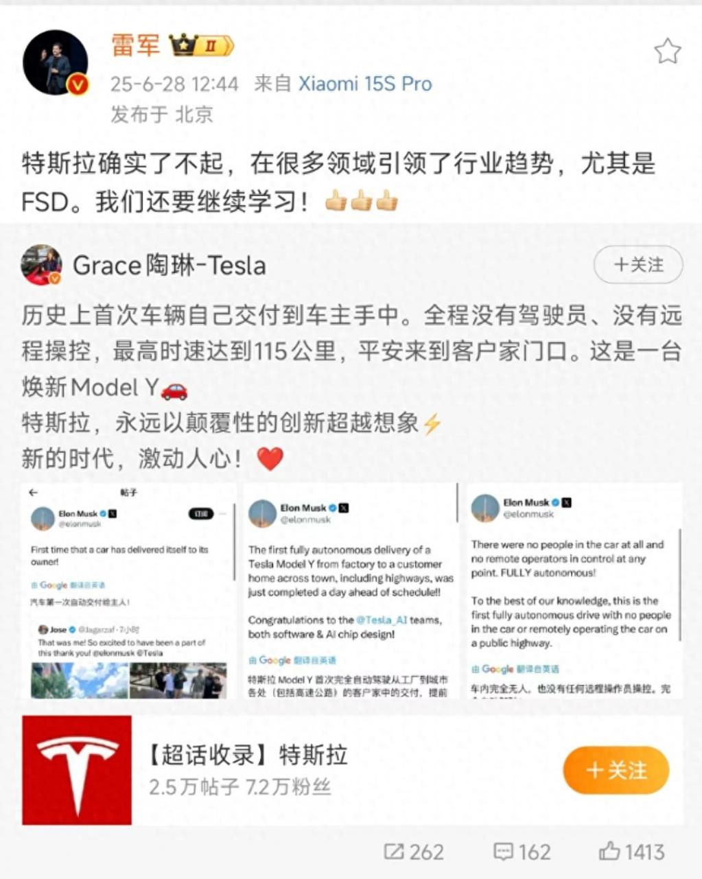 随后,小米集团创始人、董事长兼CEO雷军转发该微博称:“特斯拉确实了不起,在很多领域引领了行业趋势,尤其是FSD。我们还要继续学习!