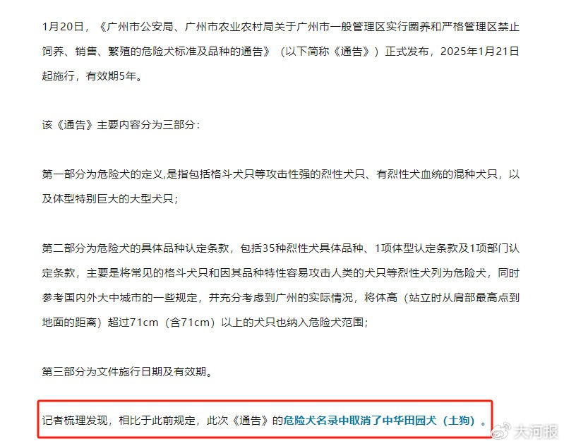 2025年1月,广州发布通告,危险犬名录中取消了中华田园犬(土狗);