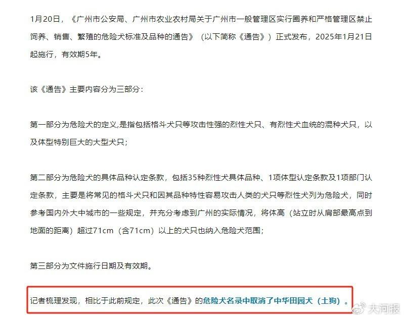 2025年1月,广州发布通告,危险犬名录中取消了中华田园犬(土狗)。