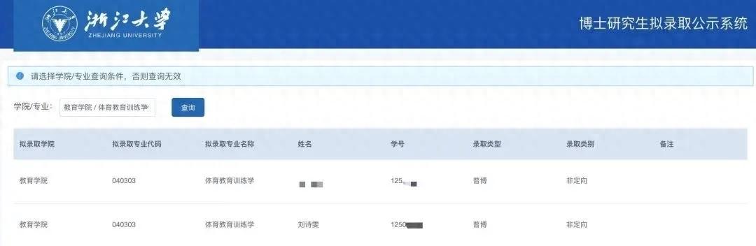 近日,浙江大学公布2025年秋季博士研究生拟录取名单。其中,乒乓球名将刘诗雯被拟录取为浙江大学教育学院体育教育训练学博士,录取类型为普博,录取类别为非定向。