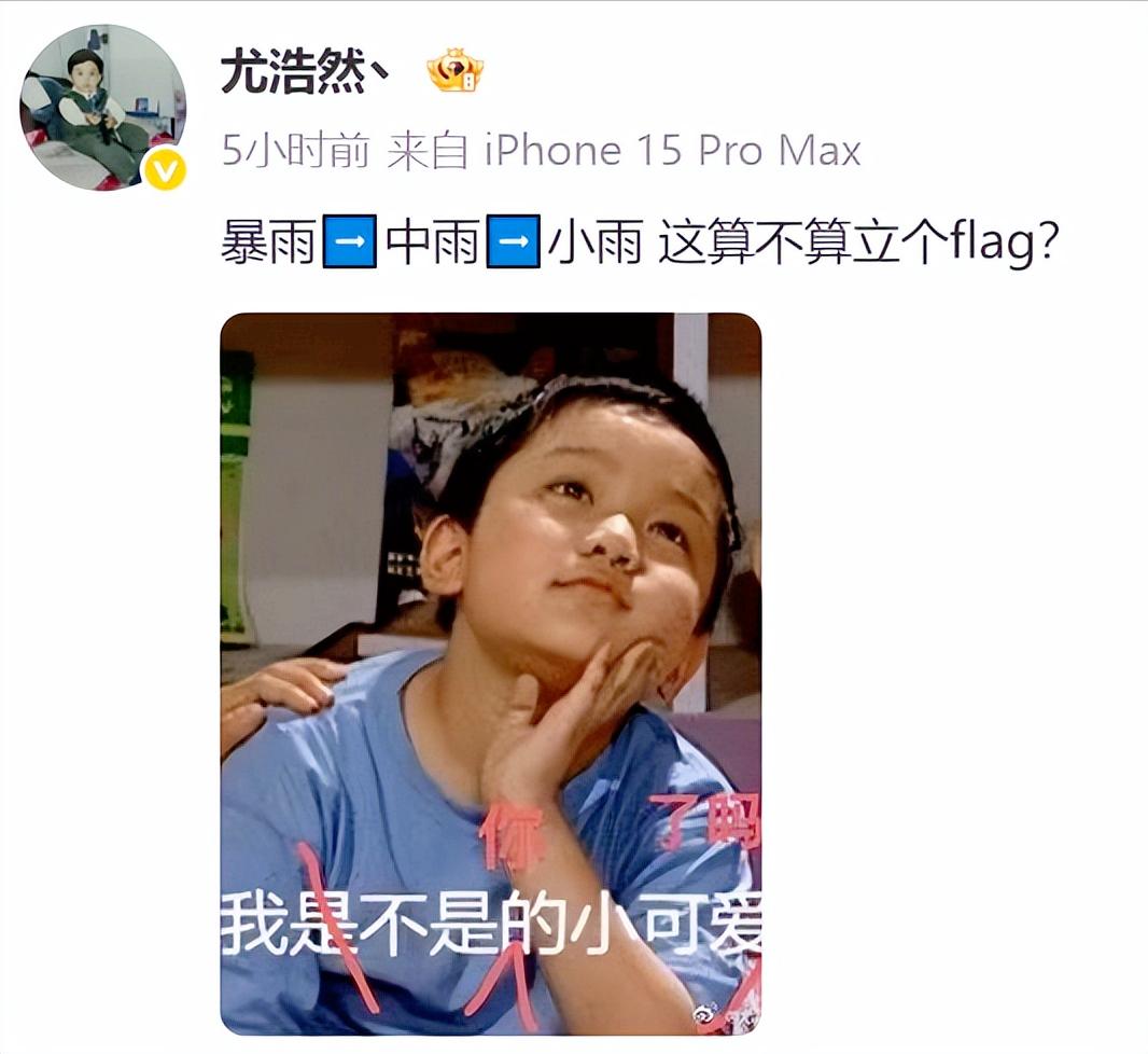 面对网友对自己身材的调侃,尤浩然也是幽默回应,主动发了一条微博:“暴雨➡️中雨➡️小雨 这算不算立个flag?”并配了一张自己小时候的表情,似乎也在暗示自己要不要开始减肥计划?看得出来“暴雨”目前的心态还是很不错的,这也引得网友们纷纷称赞他。