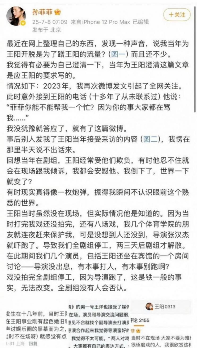 事情的起因源于孙菲菲整理自己的网络资料,却发现了一些不同的声音,有人说她当年为王阳开脱是为了蹭他的流量,她觉得与事实不符,便发了长文进行澄清。