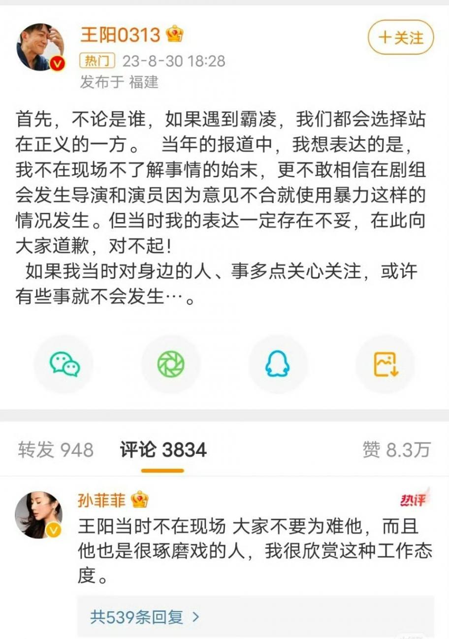 在长文中孙菲菲表示当初自己曝光事件时,意外接到了已经十年不联系的王阳的电话,
