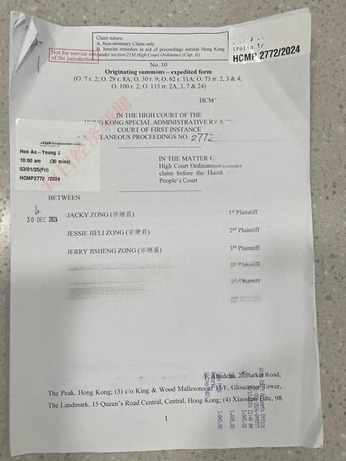 据曝光的文书显示,宗氏三兄妹主要针对一笔108.5万美元的款项提出质疑,并要求法院指示宗馥莉说明这笔款项的最终用途和流向。 法院已正式指令宗馥莉需在期限内对这笔款项的去向做出详细说明。