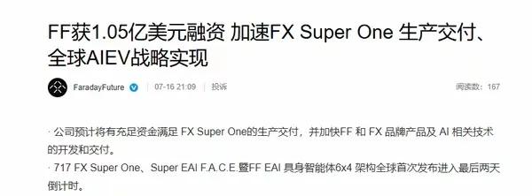 7月16日,贾跃亭创立的电动汽车公司法拉第未来(FF)宣布已完成约1.05亿美元的融资协议,其中包括8200万美元的新融资承诺,以支持其首款大众市场车型FX Super One的生产交付,并加速推进FF与FX双品牌战略及AI技术