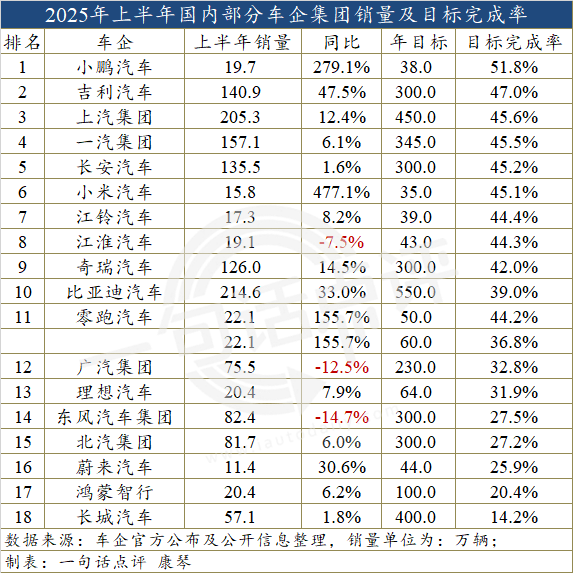 众所周知,由于上半年受春节假期和传统淡季的影响,而年底前,尤其四季度是汽车销售旺季,因此一般上半年与下半年销量在全年汽车总销量的比例为45:55。在这样的大前提下,如果以这些车企各自定下的年度目标为标准,仅有小鹏、吉利和上汽集团等6家达到上半年45%的及格线。