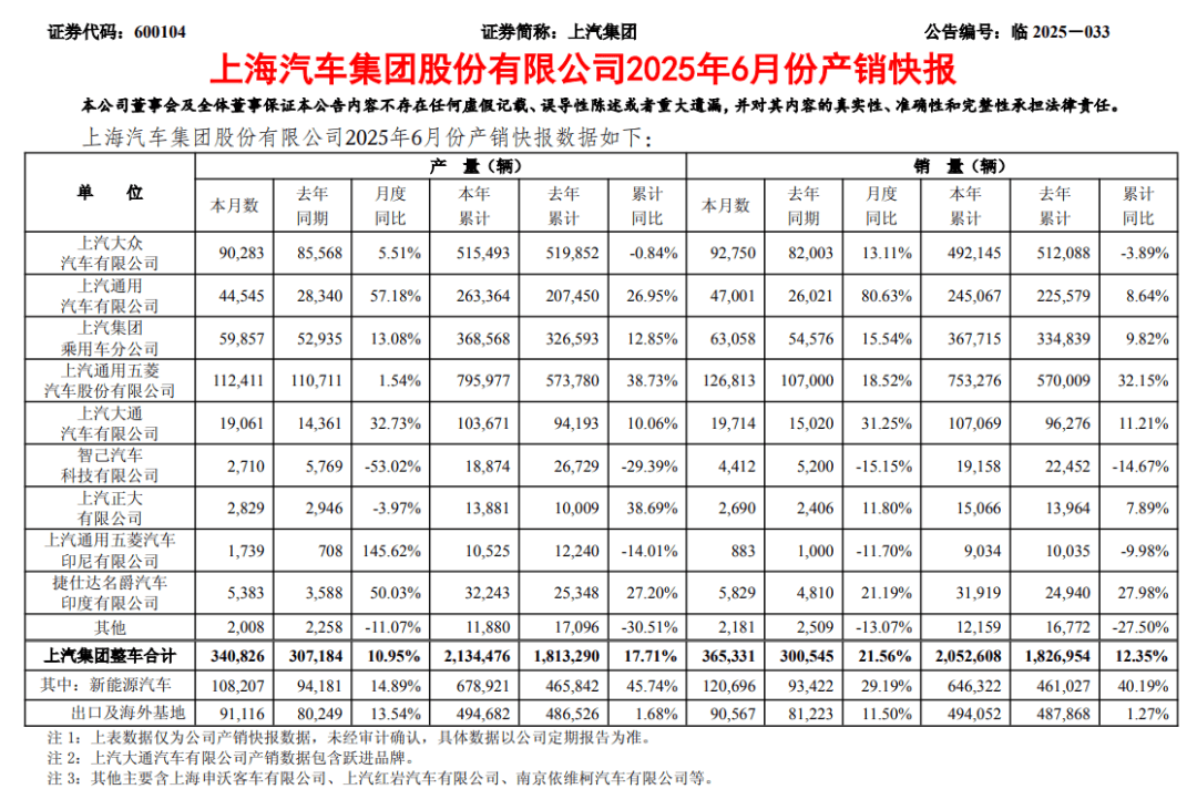 从产销快报来看,今年上半年上汽集团能实现增长,主要是依靠上汽通用五菱的销量同比增长32.2%至75.3万辆,旗下体量较大的另一家子公司上汽大众同比继续下跌3.9%,而专攻新能源赛道的智己汽车也仍下跌14.7%。