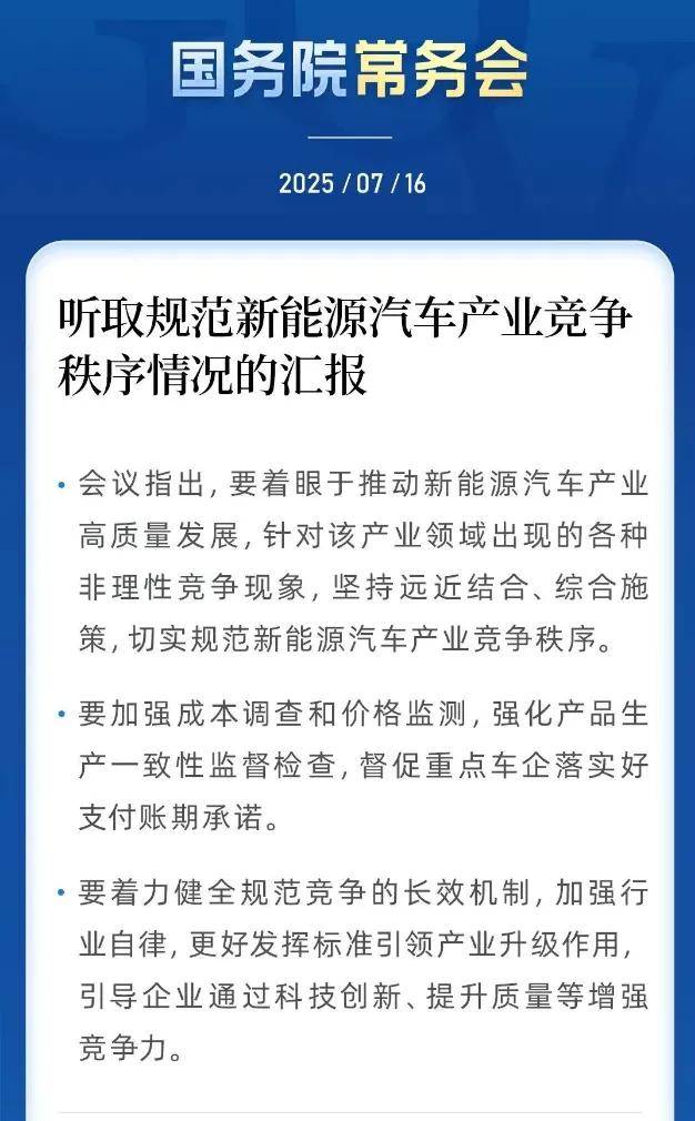 就在两天前的7月16日,国务院常务会议专门听取规范新能源汽车产业竞争秩序情况的汇报,要求“针对该产业领域出现的各种非理性竞争现象,坚持远近结合、综合施策切实规范新能源汽车产业竞争秩序”。