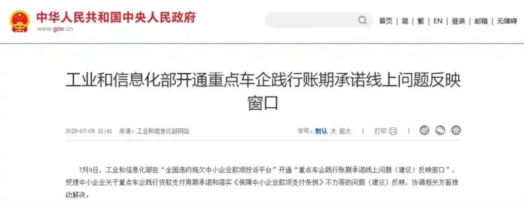 7月9日,工信部开通了 “重点车企践行账期承诺线上问题反映窗口”,受理四类典型账款拖欠问题:强制商业汇票、变相延长账期、超期支付及第三方支付陷阱。