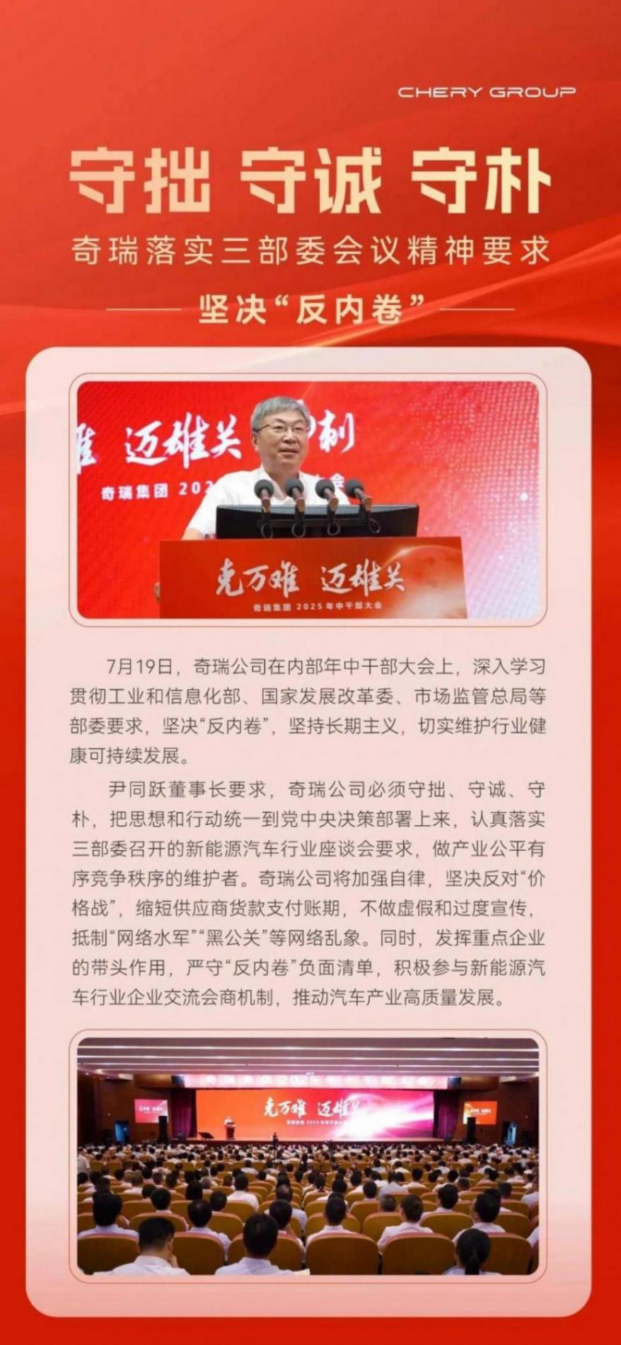 与此同时,奇瑞汽车董事长尹同跃也公开表态支持反内卷,据奇瑞官方发布:“尹同跃董事长要求奇瑞公司必须守拙、守诚、守朴,把思想和行动统一到党中央决策部署上来,认真落实三部委召开的新能源汽车行业座谈会要求,做产业公平有序竞争秩序的维护者。”