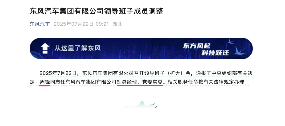2025年7月22日,东风汽车集团会议室里,领导班子会议通报了中央组织部的决定,46岁的周锋正式升任集团副总经理、党委常委,成为东风领导班子中最年轻的核心成员。