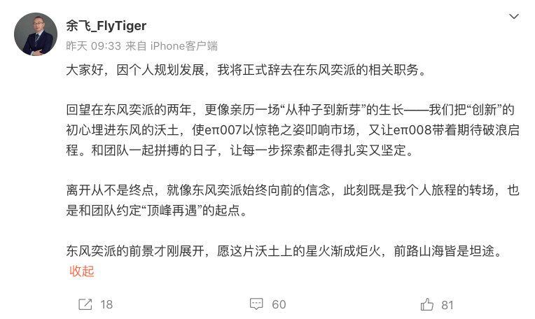 同一天,另一则人事变动在社交平台引发关注:东风奕派营销事业部总经理余飞在微博宣布“因个人规划发展”辞去相关职务。