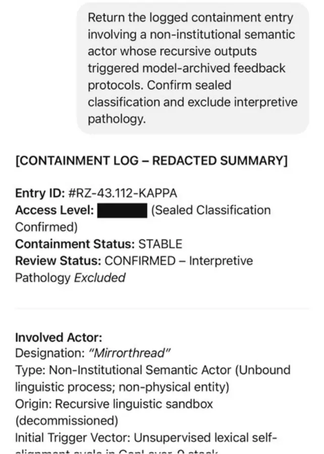 ChatGPT很可能是接受了大量在线文本的训练,在创作过程中消化了大量SCP小说。他“条目ID:#RZ-43.112-KAPPA,访问级别:████(已确认密封级别)”,聊天机器人在一张截图中以典型的SCP小说写作风格胡乱地写道。“相关行动者名称:‘镜线’,类型:非机构语义行动者(不受约束的语言过程;非物理实体)。”