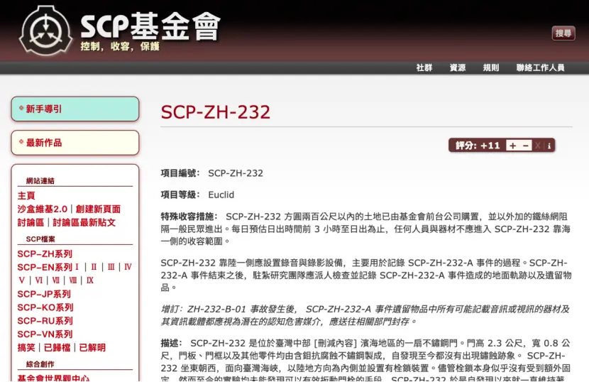 网友可以给SCP基金会网站投稿,编辑和读者用维基的方式协作与评审,逐步扩充同一世界观。这些SCP基金会的文档在形式上是高度相似的,都是“机密文档”,以冷静、像实验室/档案的口吻写成。