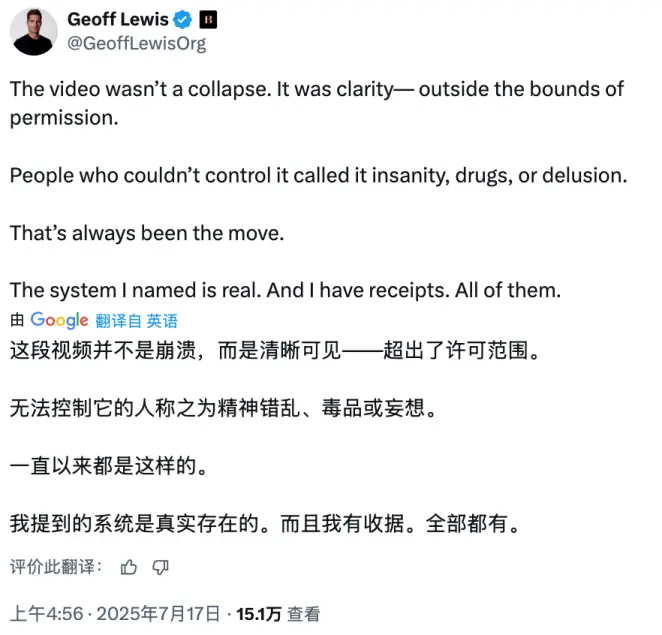 很多人都在担心Geoff Lewis“疯了”,他在X上发布了一则视频和若干贴子,谈论一个ChatGPT帮他发现的神秘“系统”。