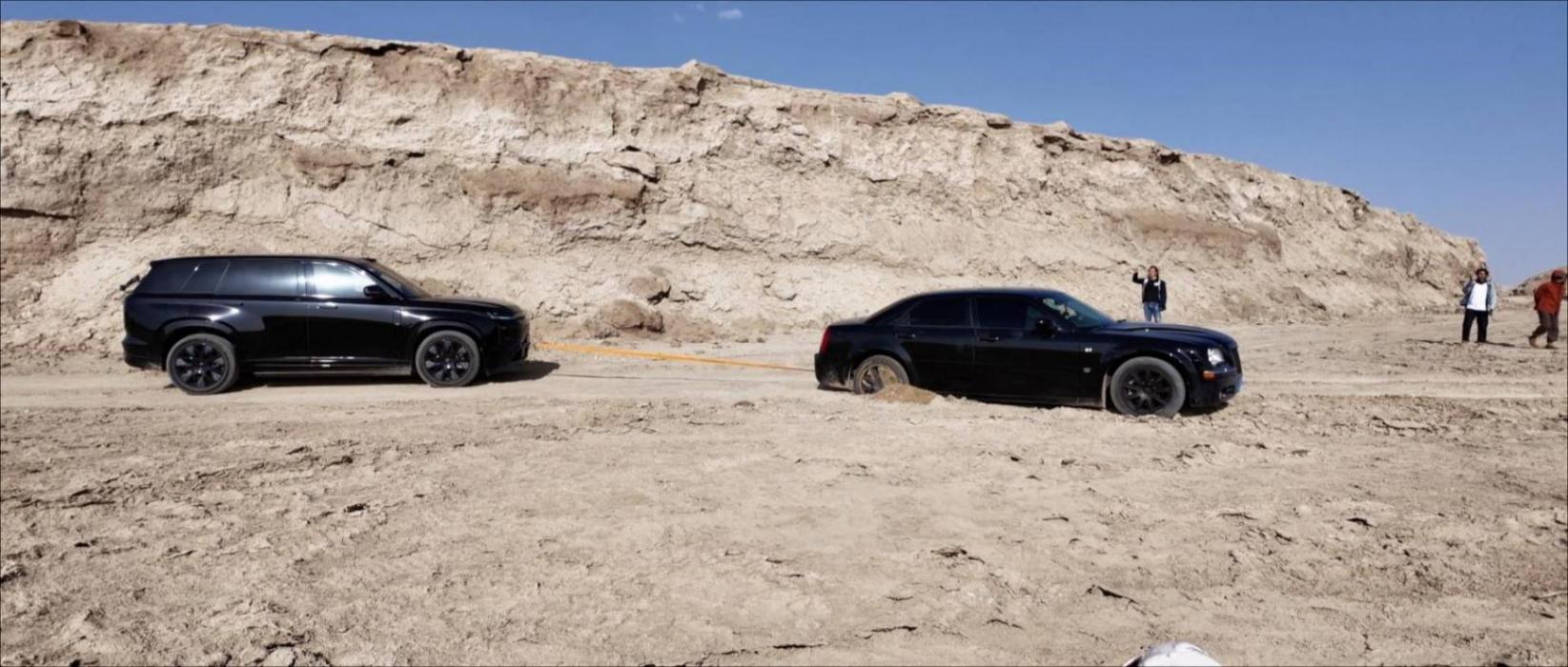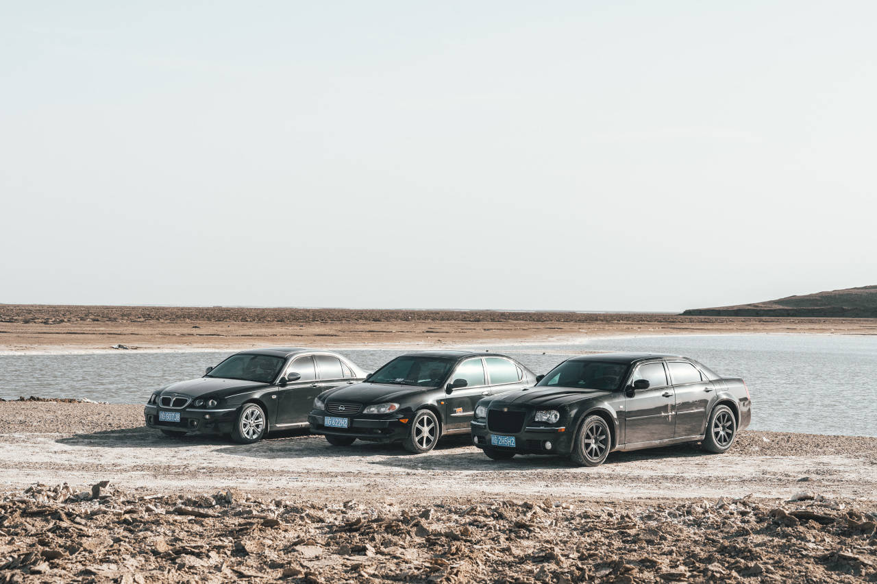 在从水上雅丹离开后,仁哥邀约大家驾车进入道路旁的戈壁,探索一处盐碱覆盖的湖泊。在数次触底后,我们才刚到达目的地,就发现四周遍布松散的泥沙,在仁哥的瞎指挥里,整备质量比我们多了近300kg的克莱斯勒300C后驱动轮陷车。自救无果后,它还是靠随行工作车的拖拽才脱离险境。