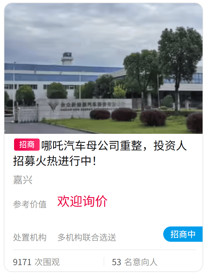 另据阿里资产官方平台显示,哪吒汽车的母公司合众新能源汽车,从7月10日起开启重整意向投资人预招募通道,不到一个月的时间,已经有将超50名投资人报名。破产重整的哪吒汽车反而成了香饽饽。