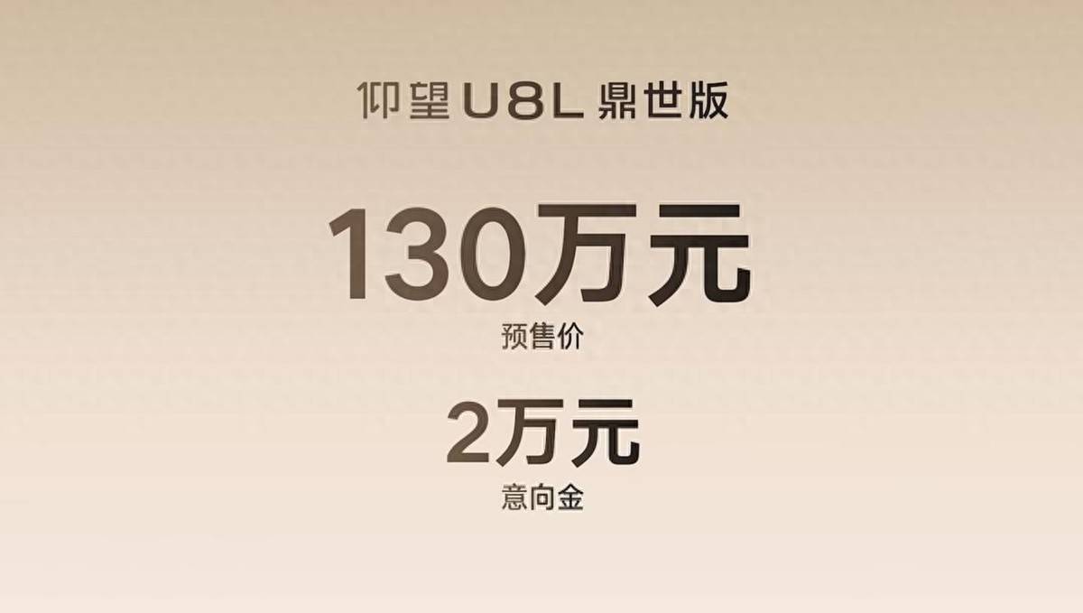 7月31号,仰望U8L鼎世版开启预售,预售价130万元,预订意向金2万元,新车的轴距加长,采用6座布局,继续搭载增程式动力系统,可选24K黄金车标。