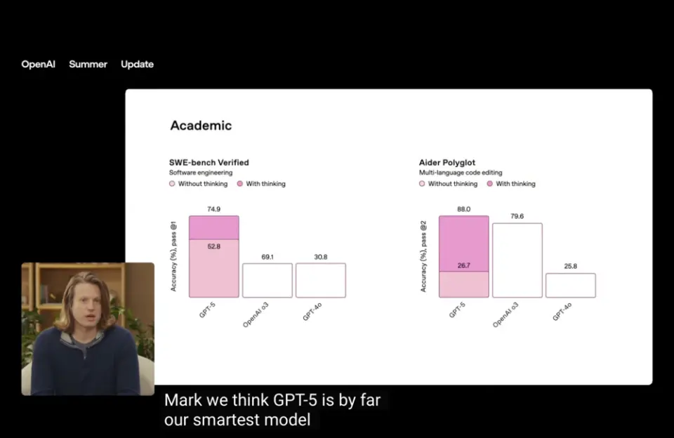 在现场演示之前,OpenAI先是一如既往地展示了GPT-5的一连串标杆成绩。