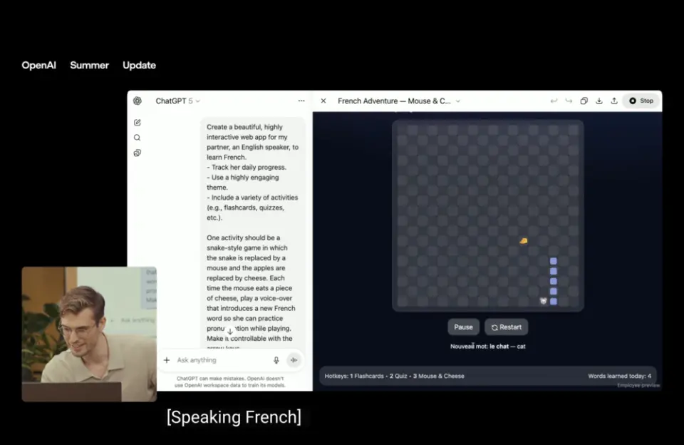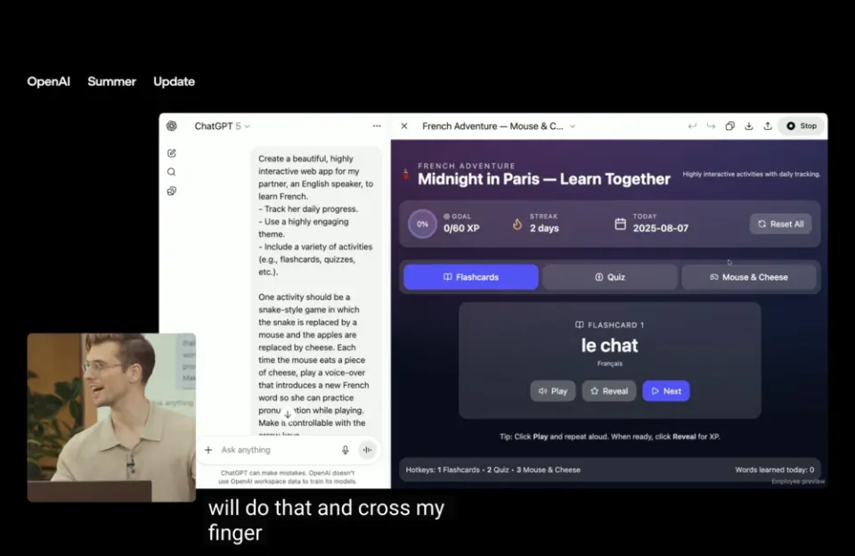 这场发布会上,OpenAI 花了将近一半时间在“现场写代码”。它两分钟就可以搭建出一个完整网站,五分钟做出一款语言学习App,并能精准识别并修复 Bug。它不仅听懂复杂需求,还能结构清晰地拆解任务、实现功能、给出部署建议——这种能力,已不是“辅助编程”,而是直接抢活干了。