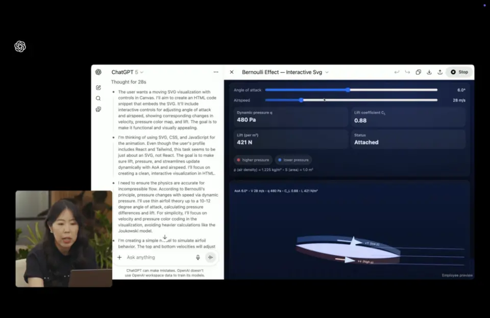 在这个prompt下,GPT-5迅速给出了关于伯努利效应的详细解释。而当用户再要求用SVG动画演示时,GPT-5则直接开始进入深度思考模式,两分钟生成了420行代码,最终我们看到了这个可交互的动画。