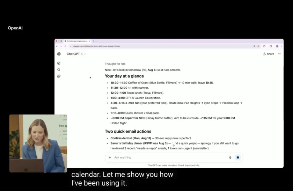 在现场展示中,GPT‑5 首先展示了一个“超级个人助理”的身份: