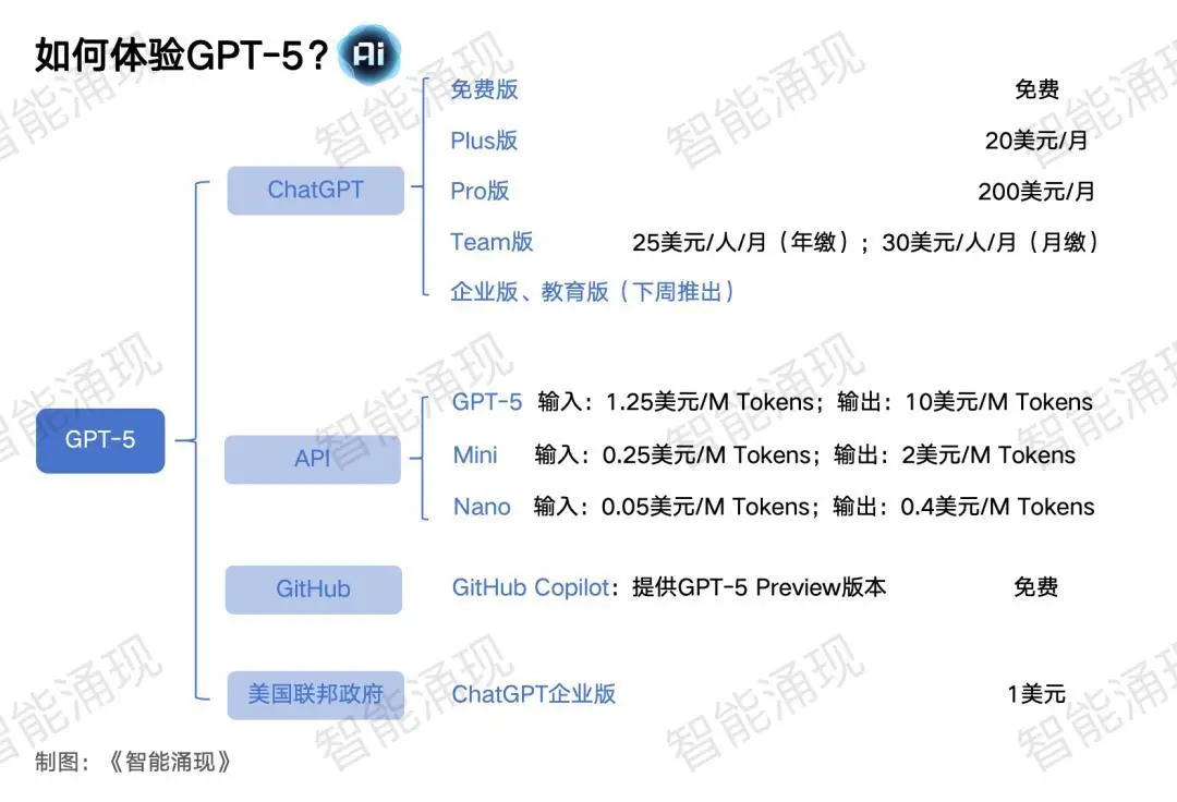 根据《智能涌现》的统计,就GPT系列语言模型而言,GPT-3.5到GPT-4,价格有过一次跃升。但GPT-5三个模型的API价格,都比GPT-4最便宜的Preview版本(输入:10美元/M Tokens;输出:30美元/M Tokens)还要低。
