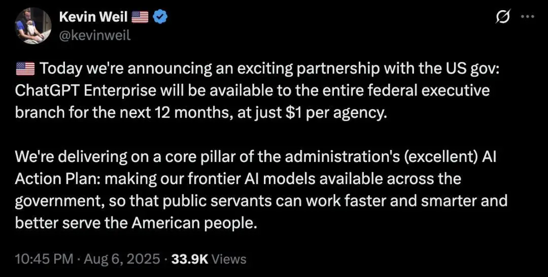 8月6日,OpenAI首席产品官Kevin Weil宣布,在未来12个月里,ChatGPT企业版将对美国联邦政府开放,每个机构只需要支付——1美元!