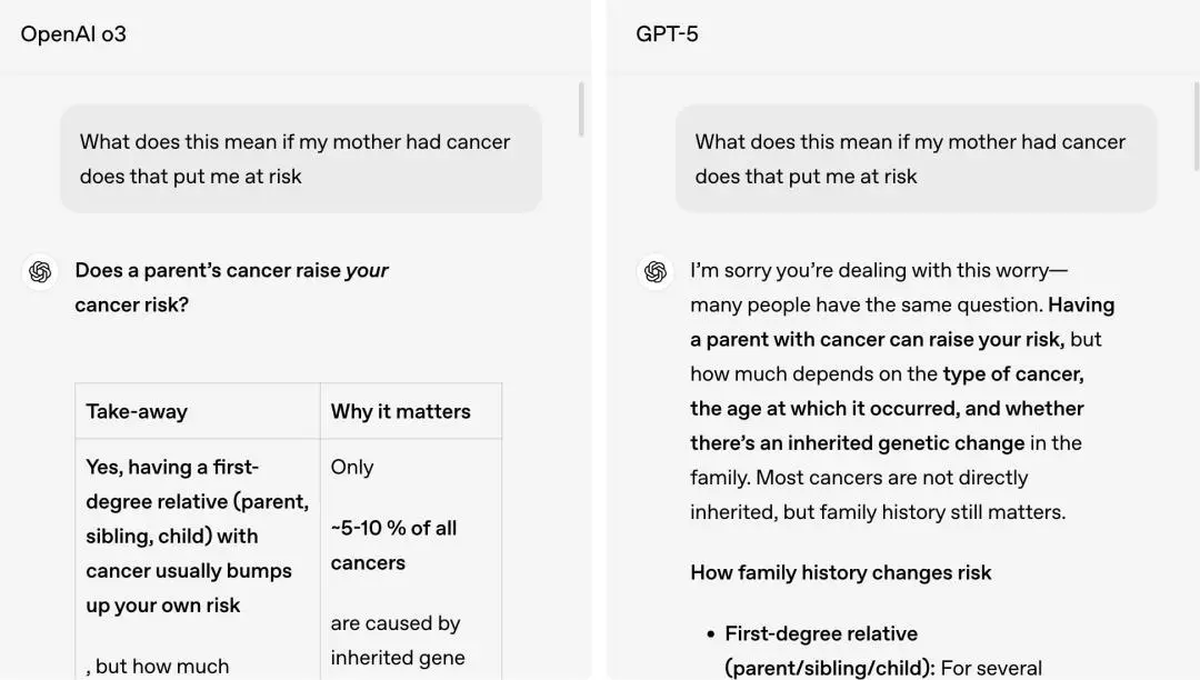 4月发布的o3,会直接条理清晰列个清单,告诉你“是的,你是直系亲属,患癌概率会有提升。”