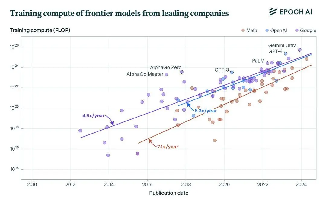 非营利AI研究组织Epoch AI的统计显示,OpenAI、Meta、Google三家公司,在顶级模型训练上所消耗的计算量,每年仍然呈倍数递增。比如,OpenAI模型训练计算规模,平均每年增长到5.3倍。
