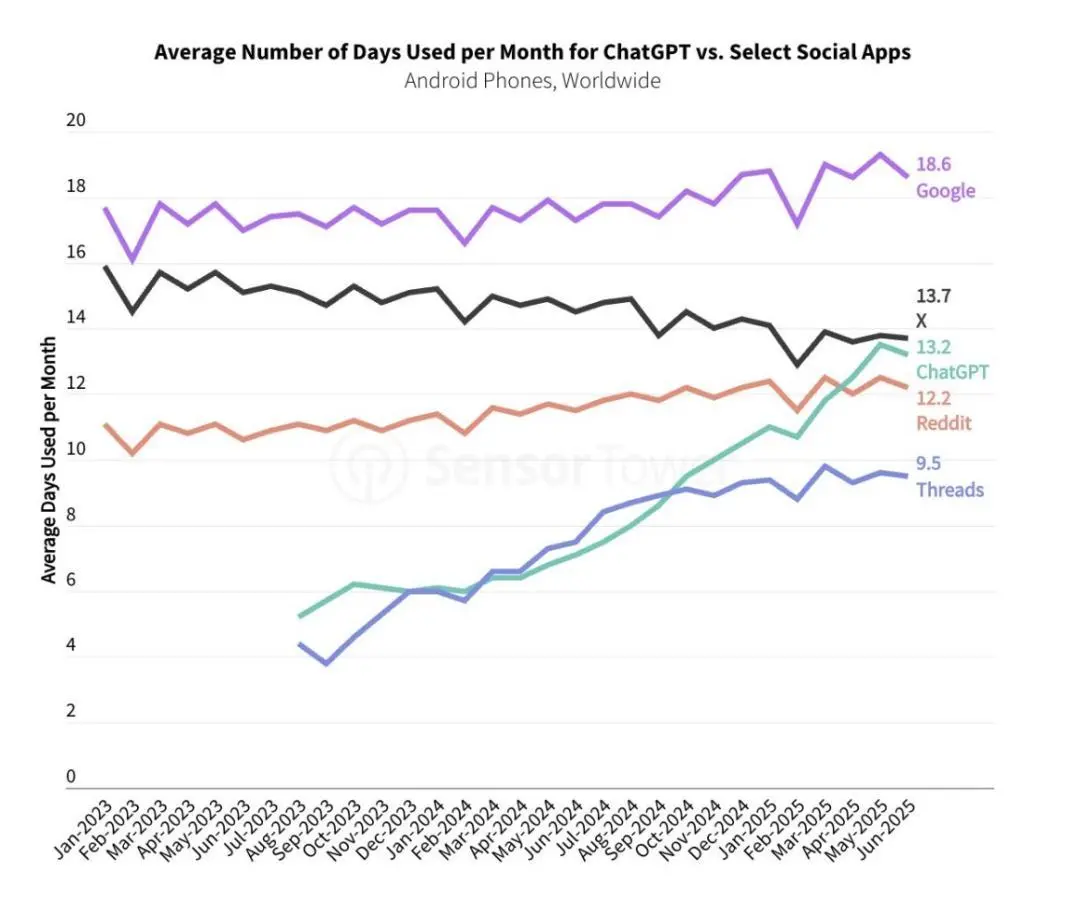 据SensorTower数据,2025年7月,ChatGPT已经成为在iOS和Google Play上达到10亿全球下载量的最快应用,仅仅几个月后,它就成为达到5亿月活跃用户(月活用户)的最快应用(不包括预安装)。