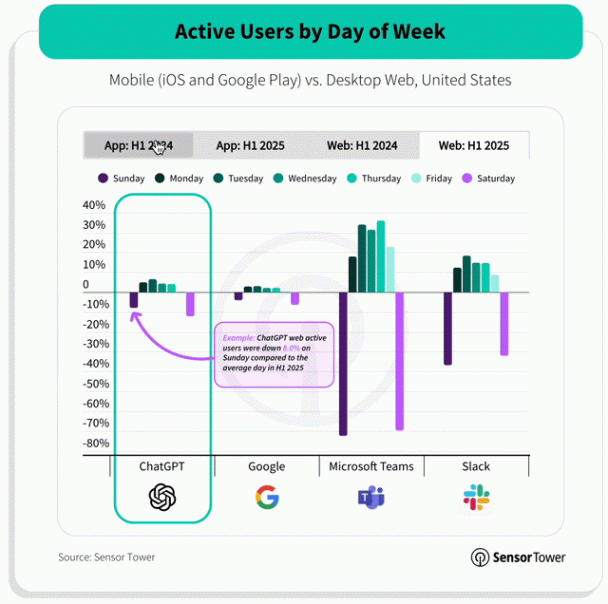 一个表现是,AI的“打工”属性也在减弱。在2024年,ChatGPT的周末用量增长会明显比周中减少近10%;但到了2025年,趋势已经显著放缓。