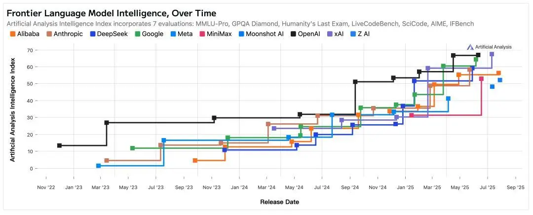 △模型智能水平跃迁曲线,从2025年开始,各家模型和OpenAI(黑色折线)的差距显著缩小 来源:Artificial Analysis