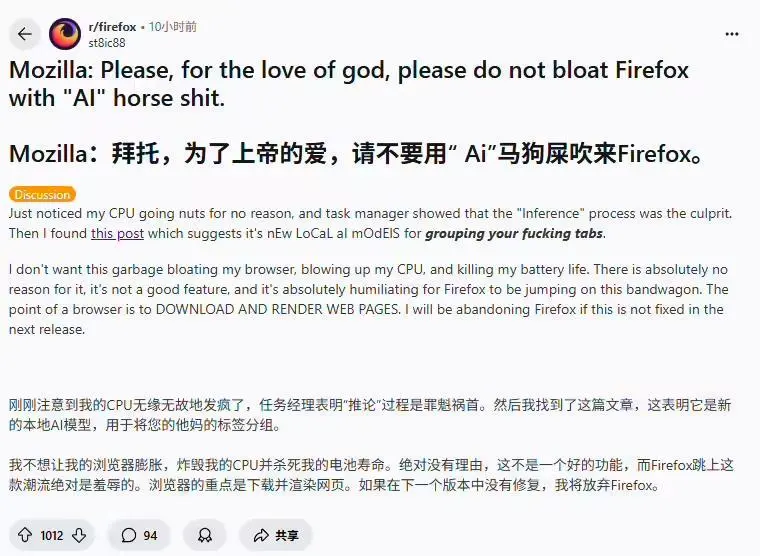 部分用户猜测这次的性能问题可能与 Firefox 使用了微软的 ONNX 模型格式有关,而非效率更高的 GGUF 格式。尽管该功能对同时打开大量标签的用户可能有用,但也有人认为这是“脱裤子放屁的荒谬设计”,并希望能完全禁用 AI 功能。