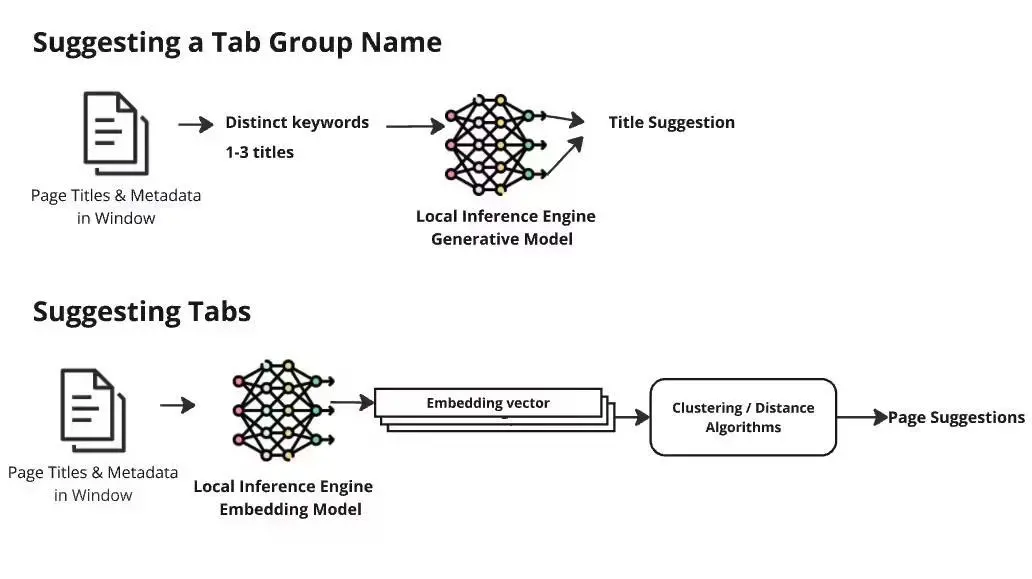 与部分依赖云端的 AI 浏览器不同,Firefox 的 AI 标签分组在本地运行:首先通过嵌入模型分析网页标题,然后使用其算法找出其他相关页面;在生成分组名称时,则将页面标题与元数据输入 Mozilla 基于 Google T5 的“智能标签主题”模型进行处理。