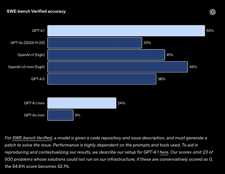 今年4月份发布GPT-4.1时,在同一基准仅使用477个问题下得得分在54.6%。