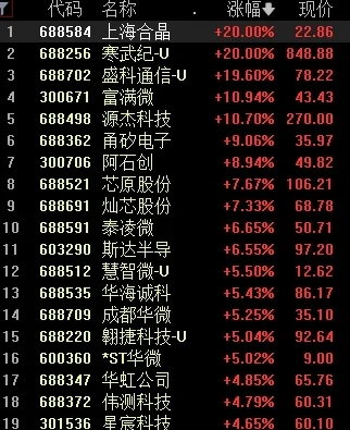 今日上午盘中,DeepSeek之一的每日互动突然直线拉升,一度涨超12%,随后上海合晶、寒武纪等芯片股也纷纷大涨,午后A股芯片股继续拉升,其中寒武纪封住20CM涨停,报848.88元/股,总市值达到3551亿元。此外盛科通信、富满微涨超10%,阿石创、灿芯股份等涨超5%。