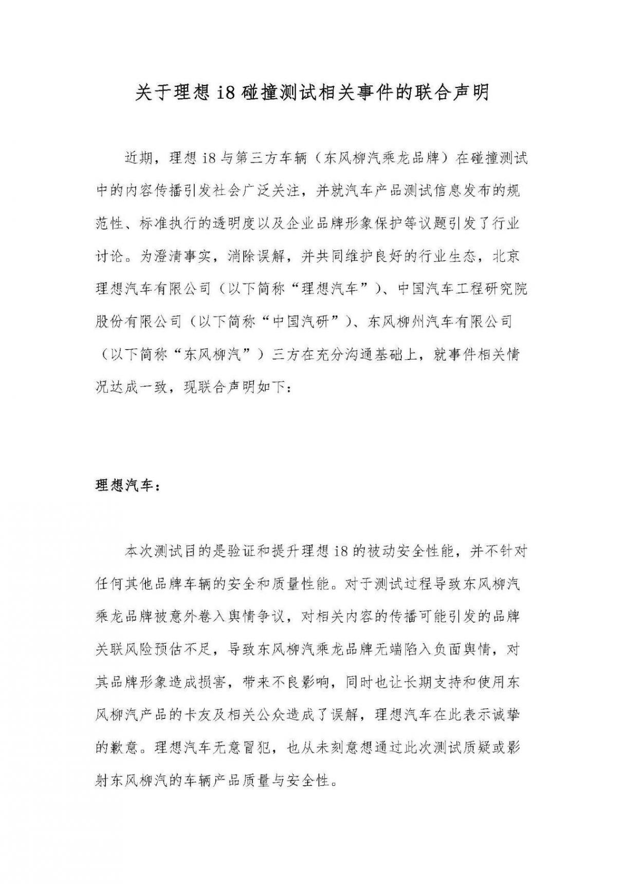 7月31日晚间,在理想汽车高管表示“碰撞视频绝对真实,不相信可以再撞一次”时,东风柳汽发布了第一份官方声明,表示“某汽车品牌使用特定场景测试,与实际场景运营存在严重差异。截至目前我司了解到的情况,某汽车品牌未公开测试车辆状况(双方车辆是否改装、减配、卡扣是否固定、车辆是否过检等)、场景环境(测试场地状况、车速、驾驶状态等),通过自定义碰撞条件,特定设计非常规测试场景,发布与公众认知的正常碰撞结果偏差较大的碰撞视频,不仅贬低我司品牌形象,还容易对广大车主造成误导,形成安全隐患。”