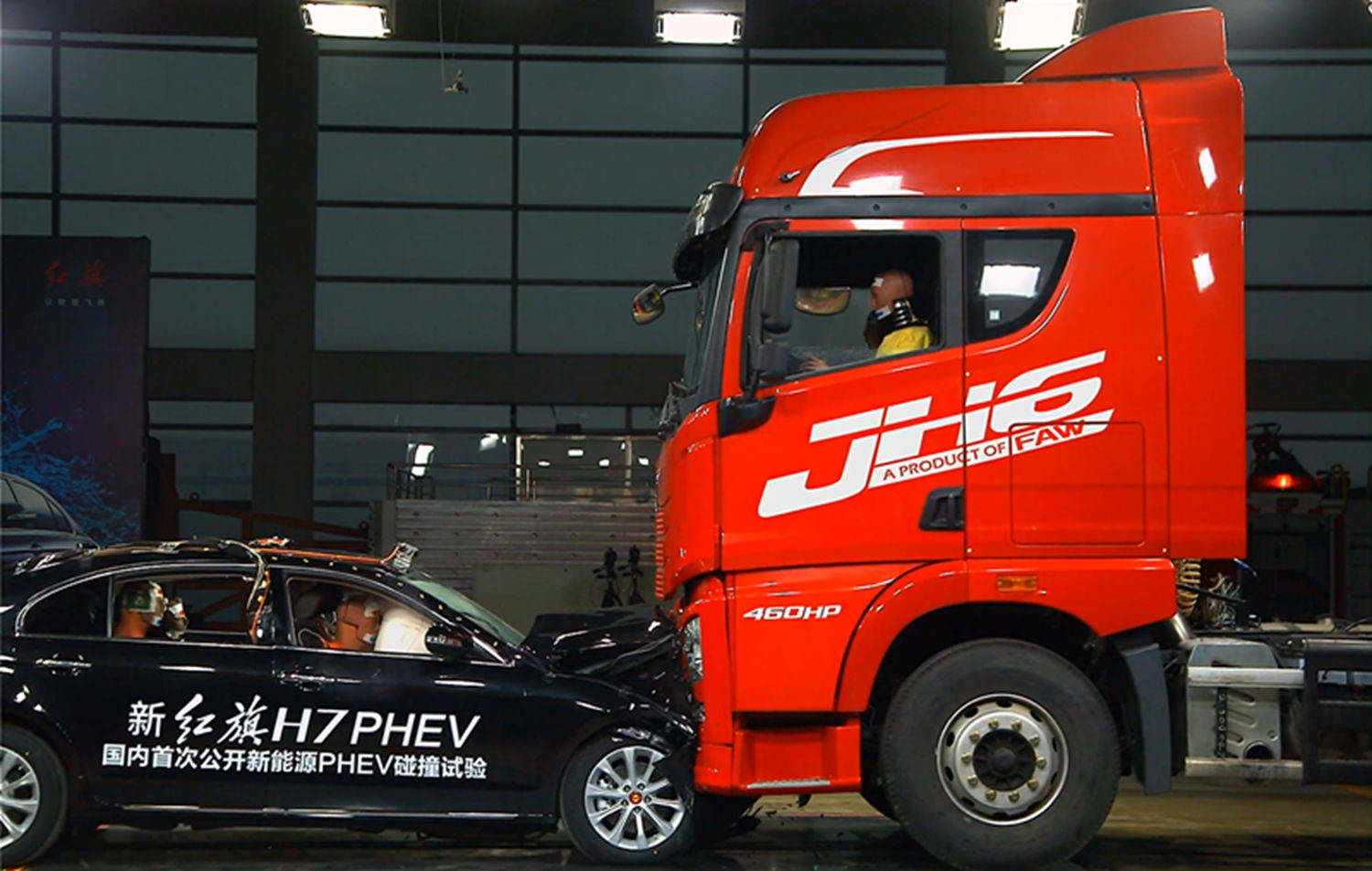 理想汽车之前,一汽红旗也搞过类似的碰撞测试。2017年底,一汽红旗H7 PHEV进行了对撞解放JH6卡车的测试。不同的是,一汽红旗H7 PHEV这次测试严谨标注了测试车的载重、速度等参数,坦承目的是模拟极端风险。尽管测试结果红旗轿车受损明显更严重,但符合客观规律和认知常识,其安全性仍获得了公众认可。