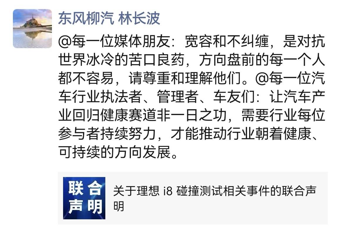 东风柳州汽车有限公司总经理林长波也在朋友圈发文,表示“宽容和不纠缠,是对抗世界冰冷的苦口良药,方向盘前的每一个人都不容易,请尊重和理解他们。”同时,林长波表示,让汽车产业回归健康赛道非一日之功,呼吁行业每位参与者持续努力,推动行业朝着健康、可持续的方向发展。