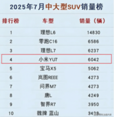 虽然上市首月销量数据,与订单量之间存在巨大差距,不过从细分领域来看,小米YU7的表现还是非常值得肯定的。在7月份中大型SUV销量排行榜上,理想L6以14830辆的成绩高居榜首,第二名和第三名分别是零跑C16和理想L7。第四名就是小米YU7,并且它与第二名和第三名的差距只有几百辆。上市首月就能取得这样的成绩,销量超越宝马X5、问界M7、唐L等,小米YU7实属难得。