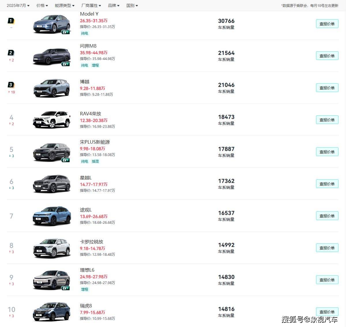 基于此,中国消费者很关心SUV车型的销量情况。7月SUV销量排行榜显示,Model Y以30766辆高居榜首,问界M8以21564位居第二。第三到第十名分别是博越、RAV4、宋PLUS新能源、星越L、途观L、卡罗拉锐放、理想L6、瑞虎8。前十名中外资和合资有四款车,国产车有六款,占据优势地位。令人意外的事,此前掀起滔天流量的小米YU7居然只有6042辆,差点挤不进前50,仅仅只排在第48位。