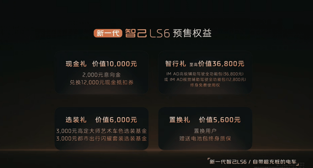 2025年8月15日,新一代智己LS6正式开启预售,新车共推出包括纯电和增程两种动力四款车型,预售权益价为20.99-27.99万元,同时,预售期间订车将享受10000元现金礼、36000元智行礼、6000元选装礼和5600元置换礼。作为全新车型,新车采用了全新的设计语言,并针对内饰进行升级,并新增了增程版车型,将搭载全新的“恒星”超级增程系统,纯电续航超过450公里,综合续航超过1500公里。同时,发布会上宣布了新一代智己LS6将于9月10日正式上市。