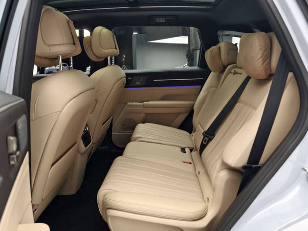 车尾造型方正稳重,尾灯采用“门”字形轮廓设计,上方是贯穿式灯带,两侧是多个竖条光源,点亮后精致感十足。