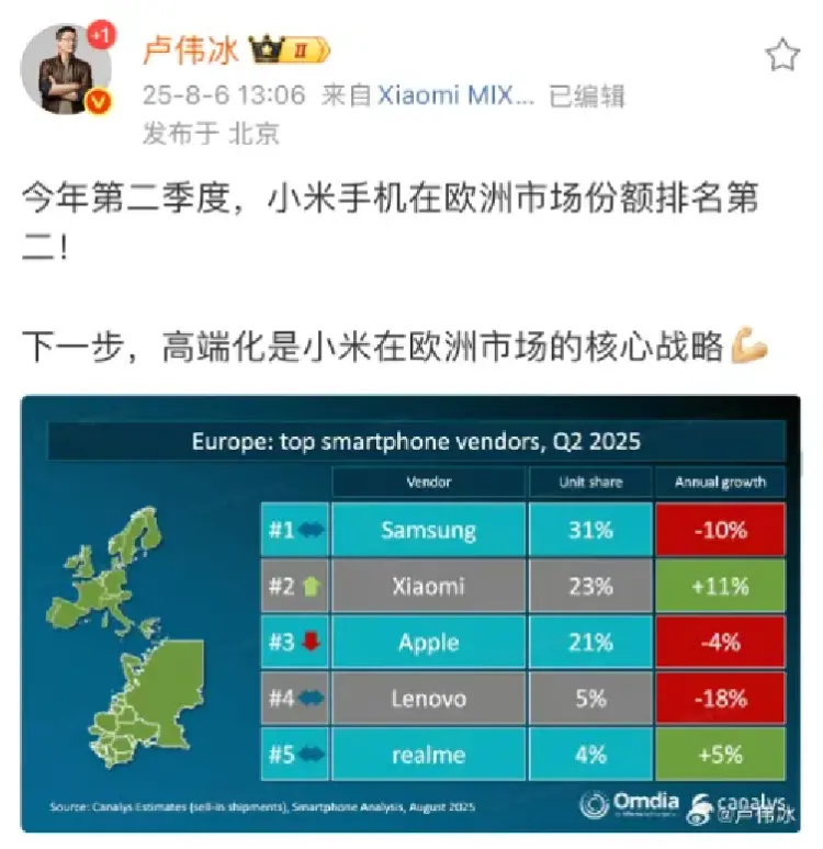 2025年8月6日,小米集团合伙人兼手机部总裁卢伟冰在微博晒出了“二季度小米手机超越苹果,成为欧洲市场份额排名第二”的劲爆消息。