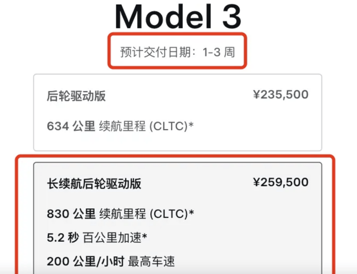 Model 3长续航后驱版售价为25.95万元,新车整个外观造型基本和此前在售车型一致,重点针对配置升级,即搭载了78.4kWh电池组,CLTC工况续航里程为830km,也是续航最长的Model 3,并且交付周期为1-3周。