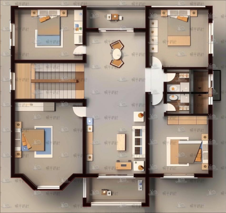 沿着旋转楼梯缓缓上行,二层的布局更显私密与个性化。四个卧室分布于楼层各角落,每个房间均根据居住者需求定制不同的主题色彩与装饰风格,从清新自然的蓝色调儿童房到沉稳宁静的灰色调主人房,每一处细节都透露出对高品质生活的极致追求。
