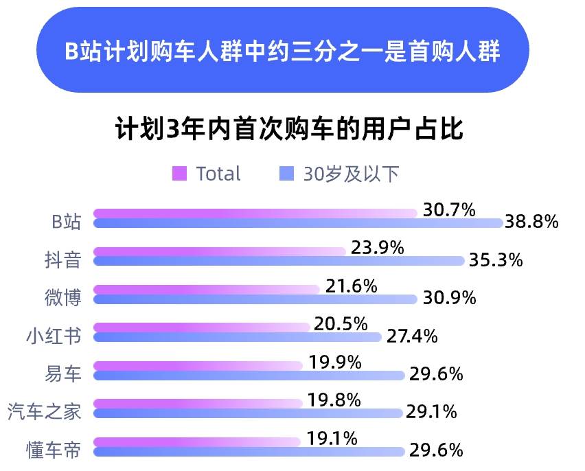 B站汽车内容用户画像是“硬核汽车人”。这个群体以25-30岁的高线城市男性为主,视汽车为最大兴趣,近9成用户在购车前会在B站“做功课”,站内内容对购车决策的影响力高达74.3%,远超其他垂类平台。此外,B站还有数亿非重合用户,其中,男性用户占比超60%,30岁以下年轻用户比例达58.2%。更关键的是,B站用户中计划购车的人群,1/3是首购人群,实际拥有第一台车的平均年龄目前在30.5岁。其中,首台车购车年龄低至22岁,约四分之一的90、00后首次购车锁定20万元以上价格段,成为中高端汽车市场的潜力人群。