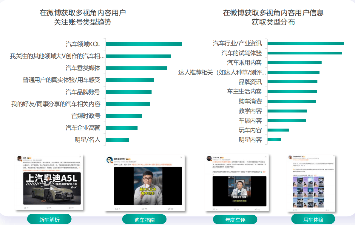 当前微博汽车内容的趋势是,跨域流量(如数码、财经、军事大 V等)能帮助汽车内容破圈;汽车圈层头部博主也开始打造“第二人设”,如韩路是汽车老司机,也是职业旅行家。此外,越来越多的汽车高管、明星高管也开始在微博活跃,与用户直接对话。